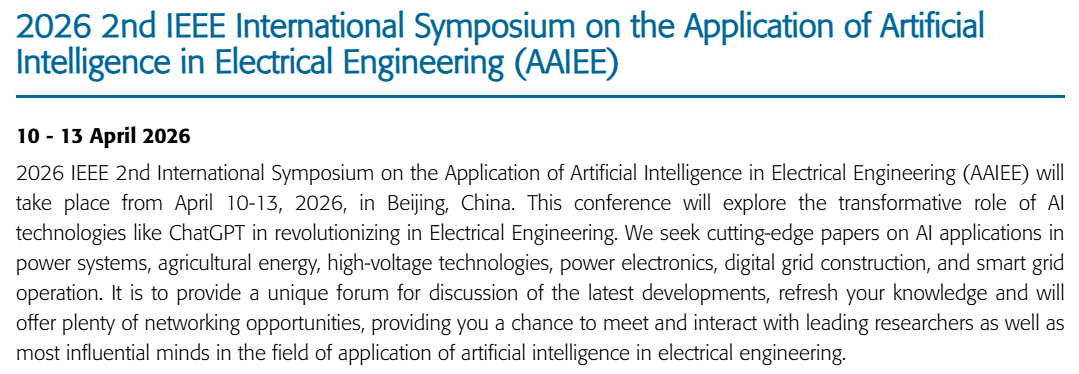 It is a great pleasure for us to invite you all to participate as speaker, delegate, sponsor at the 2026 IEEE 2nd International Symposium on the Application of Artificial Intelligence in Electrical Engineering (AAIEE) and 2026 IEEE Smart Village Forum for China, which will take place from April 10-13, 2026, in Beijing, China. It's sponsored by Institute of Electrical Engineering, Chinese Academy of Sciences (CAS), IEEE China Council, co-hosted by China Agricultural University, IEEE Smart Village - China Committee, patrons with China Electric Power Research Institute Co., Ltd, Wuhan University, State Grid Tianjin Electric Power Company Co., Ltd., State Grid Jiangsu Electric Power Company Co., Ltd., The Institute of Engineering and Technology (IET), Global Chinese Power & Energy Society, The Chinese University of Hong Kong (Shenzhen), China University of Geosciences (Beijing), Tianjin University.